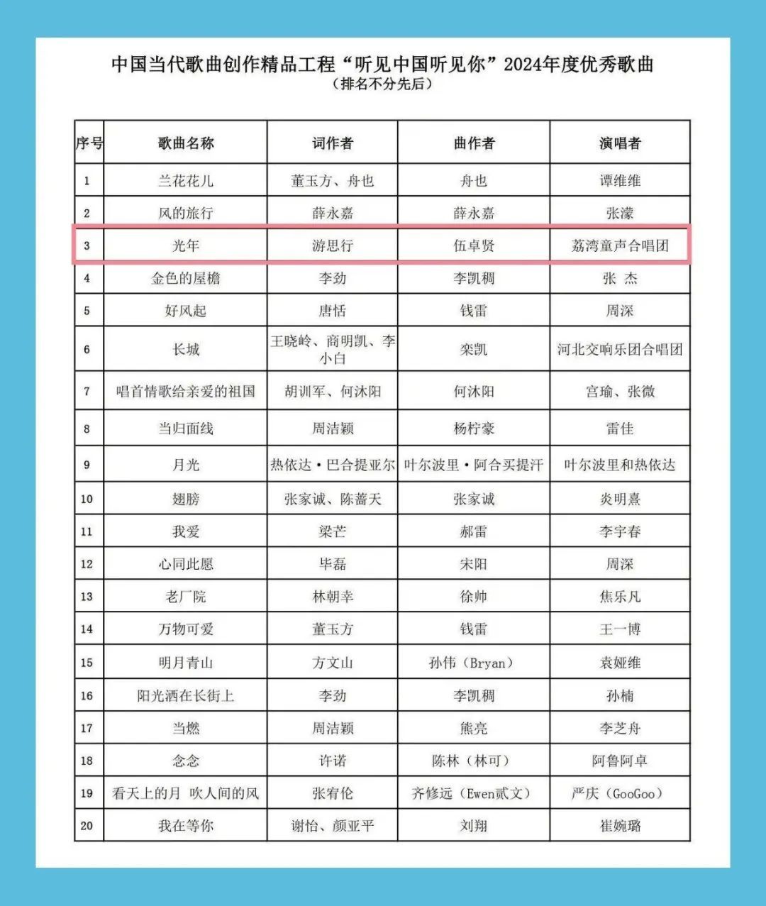 近日,“中国音乐家协会”官微发布“听见中国听见你”2024年度优秀推选歌曲,包括张杰演唱的《金色的屋檐》、周深演唱的《好风起》、李宇春演唱的《我爱》等20首歌曲入选。值得关注的是,来自广州的荔湾童声合唱团演唱的《光年》也入选其中。